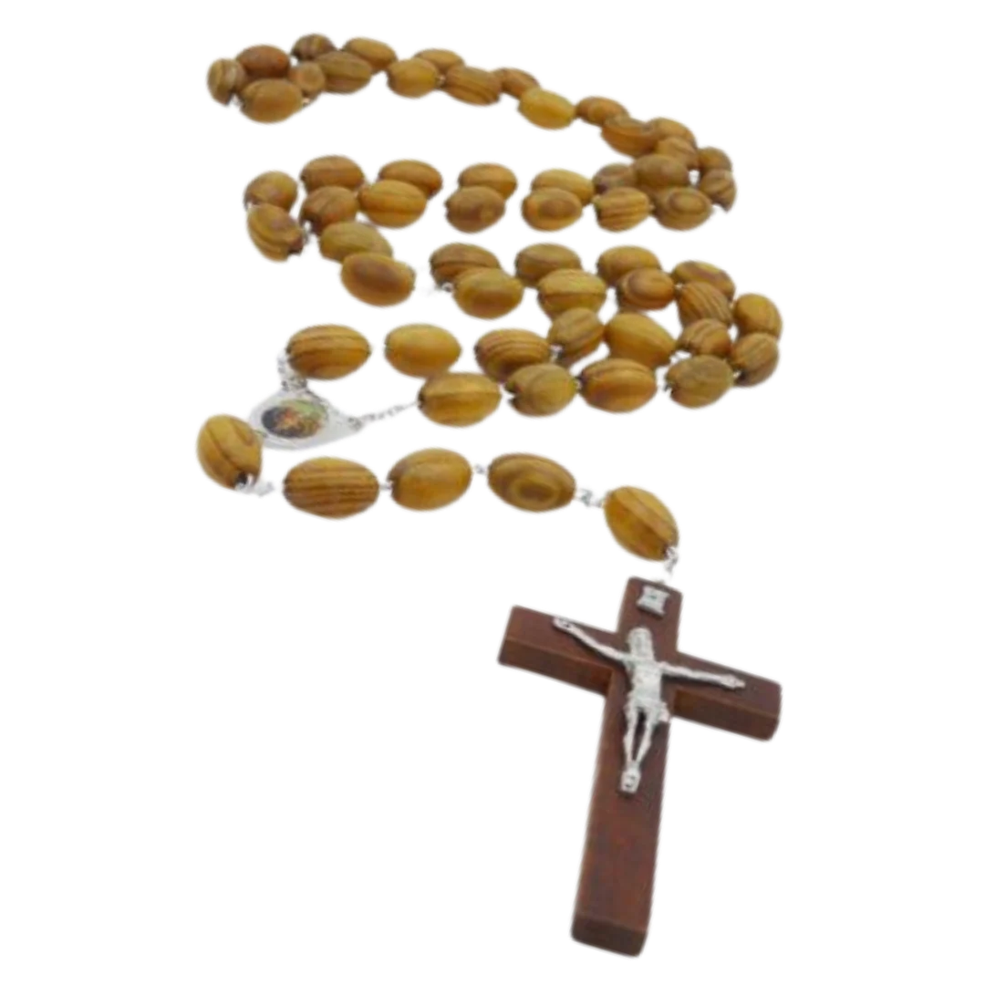 This Big Wall Wooden Bead Rosary is beautifully crafted with dark brown oval wooden beads and finished with a silver Holy Family picture pendant, making it a striking and meaningful devotional piece for any home or prayer space.