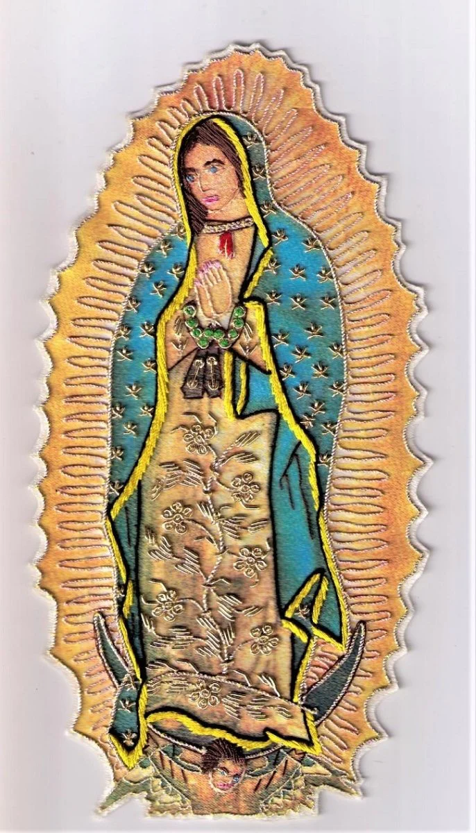 Hand embroidered Perpetual Help and Guadalupe images shown.